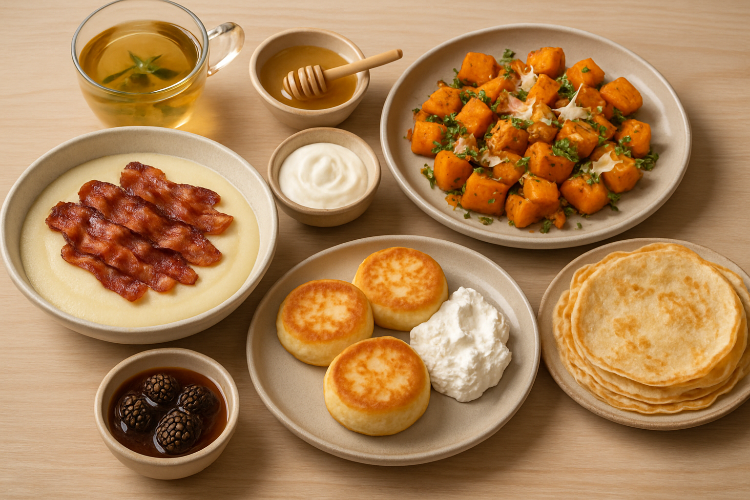 Пшённая каша с карамельным беконом, тыквой с травами и пармезаном. Нежные сырники с творогом и рикоттой. Тонкие домашние блинчики. Травяной чай, мёд, сметана, варенье из шишек.