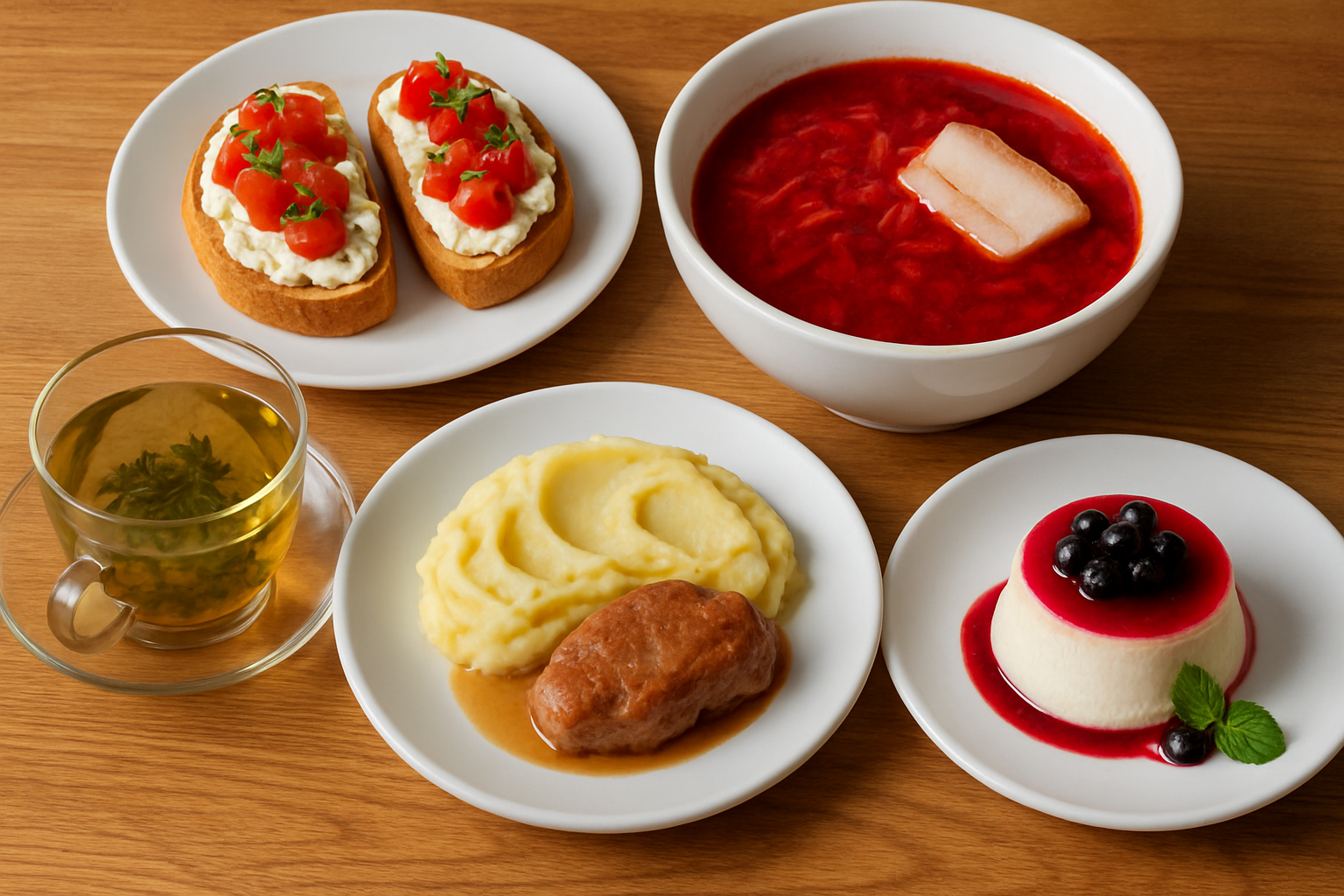 Картофель толчёный с мясом. Панна‑кота с рикоттой и черноплодной рябиной. Травяной чай.